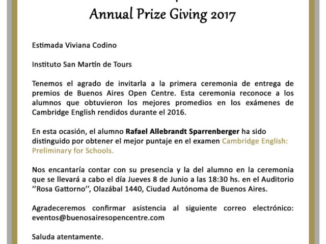 Felicitamos al alumnos Rafael Allebrandt Sparrenberger, quien recibirá un premio por su excelente desempeño en el examen Pet for schools (Cambridge) rendido en 2016. A su vez en dicha ceremonia se hará una mención especial a nuestro colegio, por sus excelentes logros académicos.
