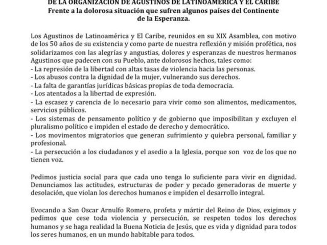 Comunicado de la Organización de Agustinos de Latinoamérica y el Caribe