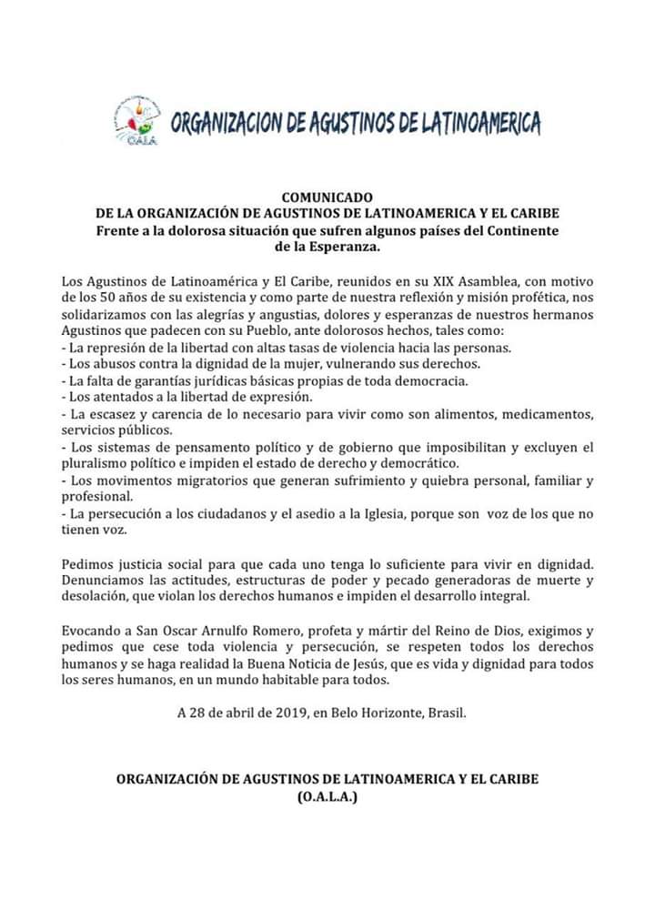 Comunicado de la Organización de Agustinos de Latinoamérica y el Caribe